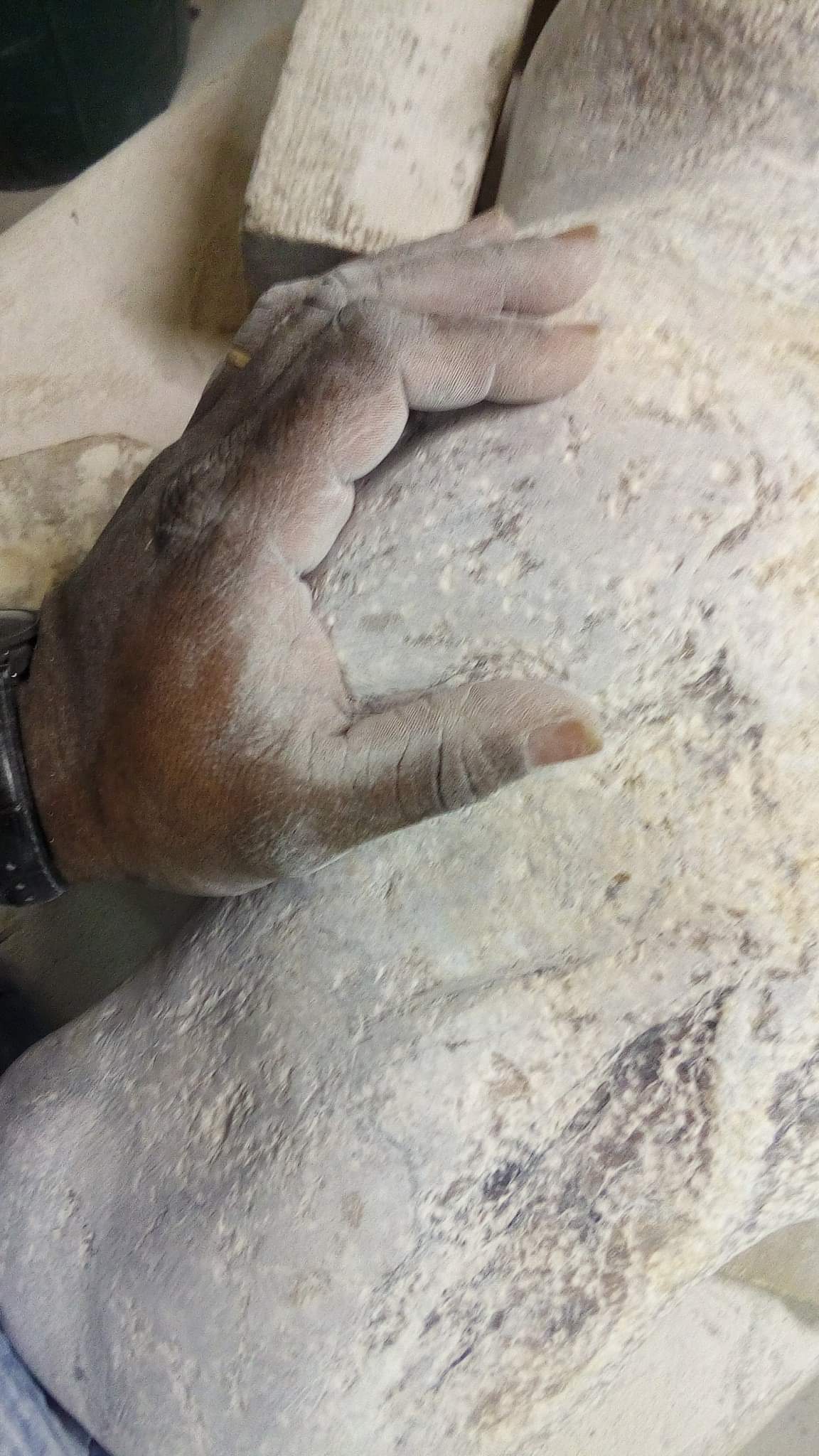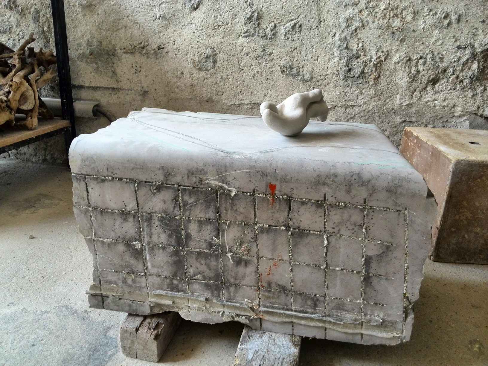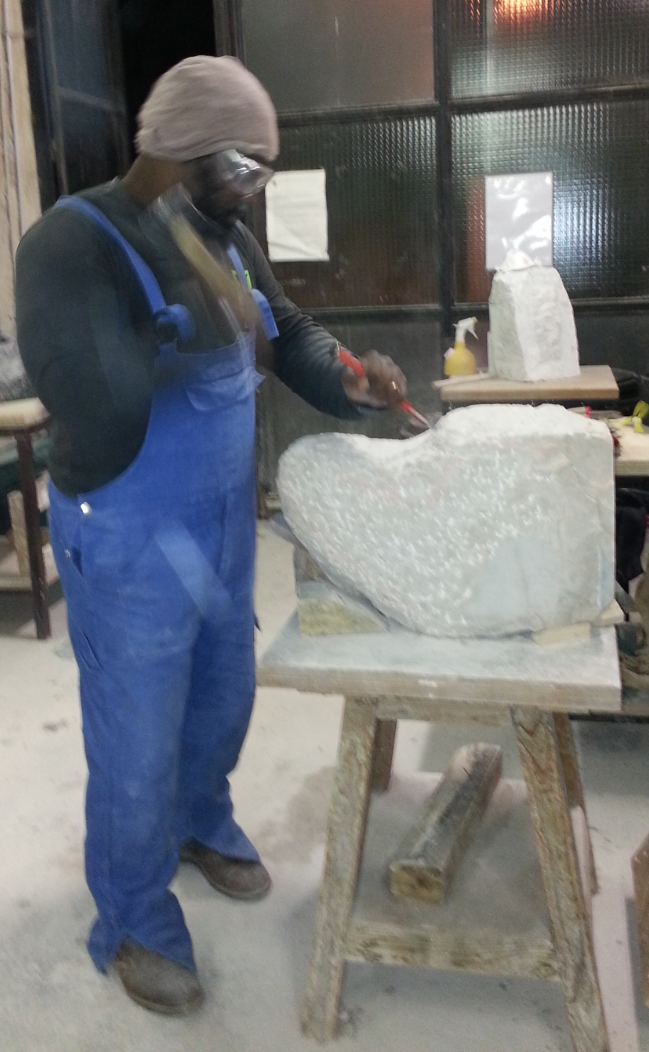 Ce que j’aime dans la sculpture sur pierre c’est la taille directe. Partir de la pierre, ses failles, ses fêlures, être à l’écoute du moindre petit signe. Comme un chef d’orchestre, j’aime battre la mesure, taper en rythme pour dégrossir la pièce à la pointe.
